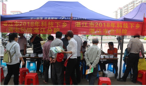 2018年4月9-13日,省农科院植保所吴寿迁副所长,湛江分院办公室主任邓铭光研究员,驻点科技人员傅友强博士、李武副研究员、孙敏华博士等5人参加了由省农业厅、省农展馆和湛江市农业局组织,各县(市、区)农业局联合举办的湛江市2018年科技下乡活动周,活动分别在坡头区、吴川市吴阳镇、廉江市安铺镇、麻章区和徐闻县等地进行。本次活动,分院派发了省农业科学院的主导品种和主推技术等实用科技资料1450余份,主要为水稻新品种、水稻栽培新技术、玉米新品种、蔬菜、果树、病虫害防治、畜禽养殖等。在坡头区科技下乡活动中,湛江电视台等媒体对邓主任进行了特别采访,邓主任在发言中指出,分院将依托省农科院的技术力量,在新品种,新技术等方面全力服务湛江农业,为湛江农业的增产增收做出应有的贡献。活动期间还对当地特色的农作物如水稻、玉米、香蕉、荔枝等的种植基地进行了参观和现场指导。本次活动受到了当地农民和种植大户的热烈欢迎和一致好评。
